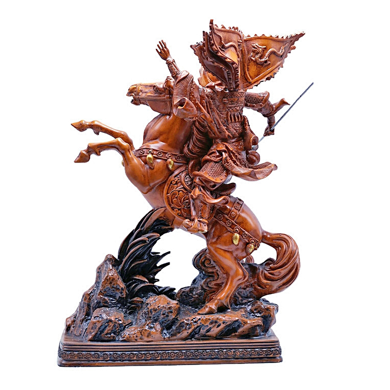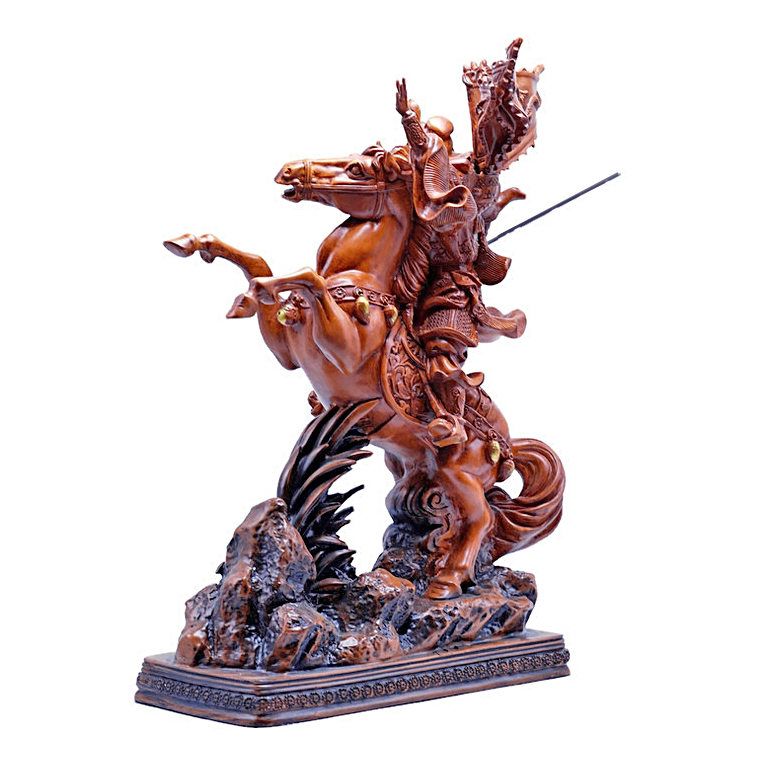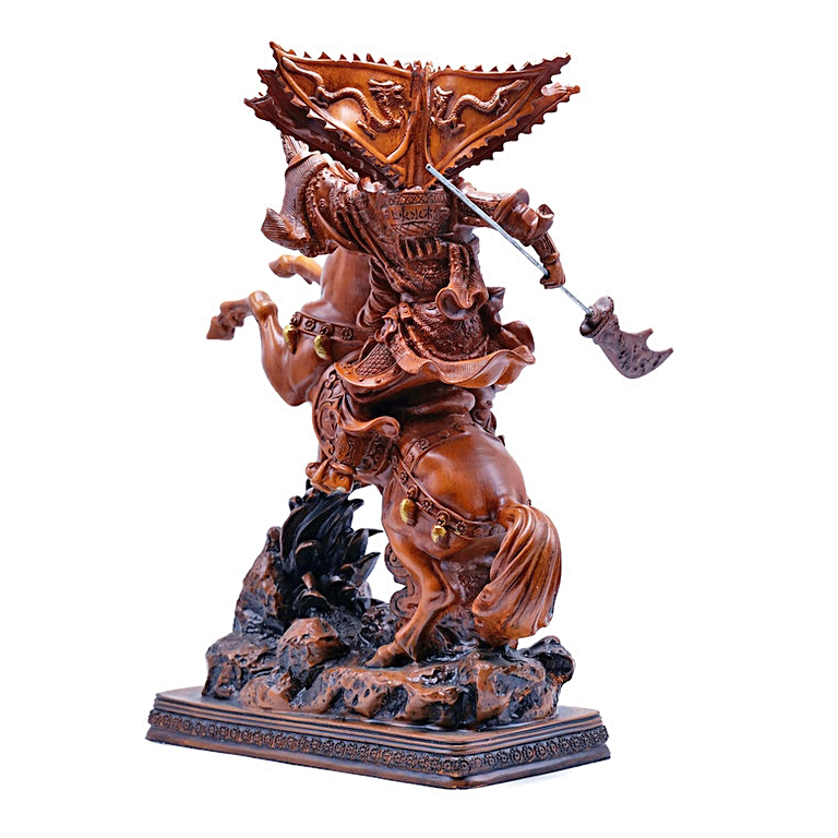 เทพเจ้ากวนอู หรือ กวนกง เทพเจ้าแห่งความซื่อสัตย์ ในอริยาบท ทรงม้าศึกชื่อเซ็กเธาว์ หรือกระต่ายแดง สุดยอดม้าศึกใน ตำนานสามก๊ก ซึ่งสามารถวิ่งได้ พันลี้ต่อวัน หรือ 520 กิโลเมตรต่อวัน องค์กวนอู ในชุดนักรบ กำง้าวมังกร ความสูงจากพื้นถึงปลายหมวกองค์ 16 นิ้ว