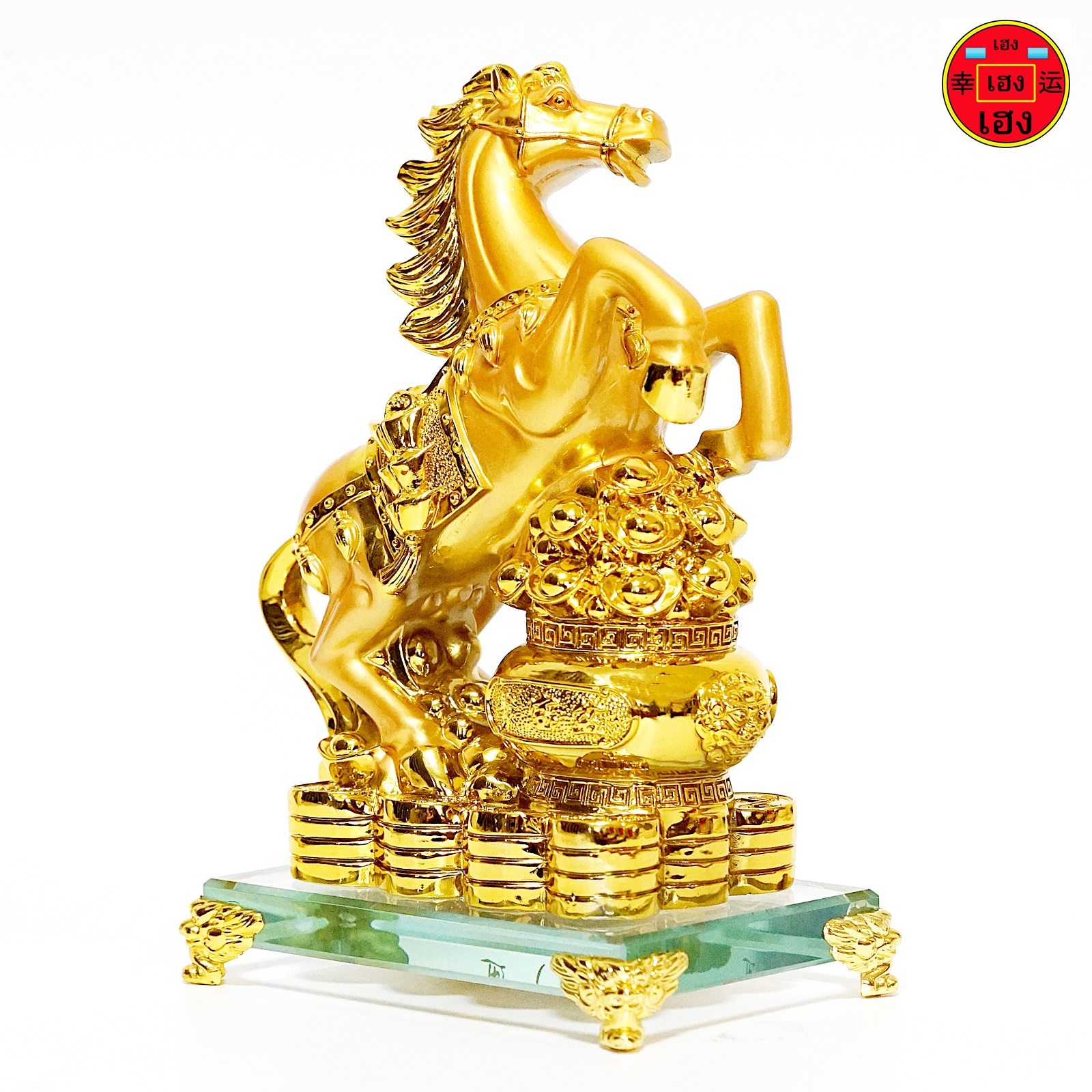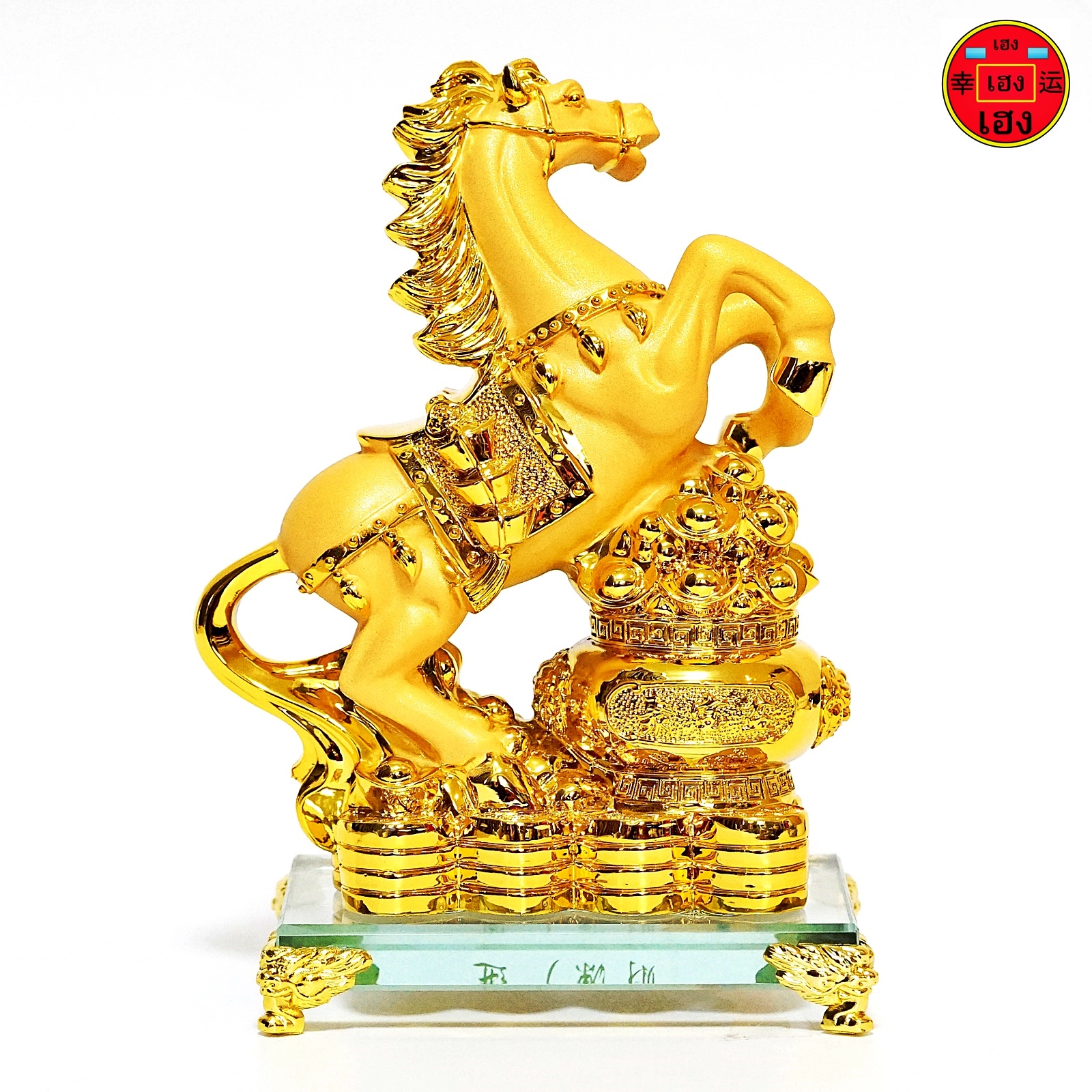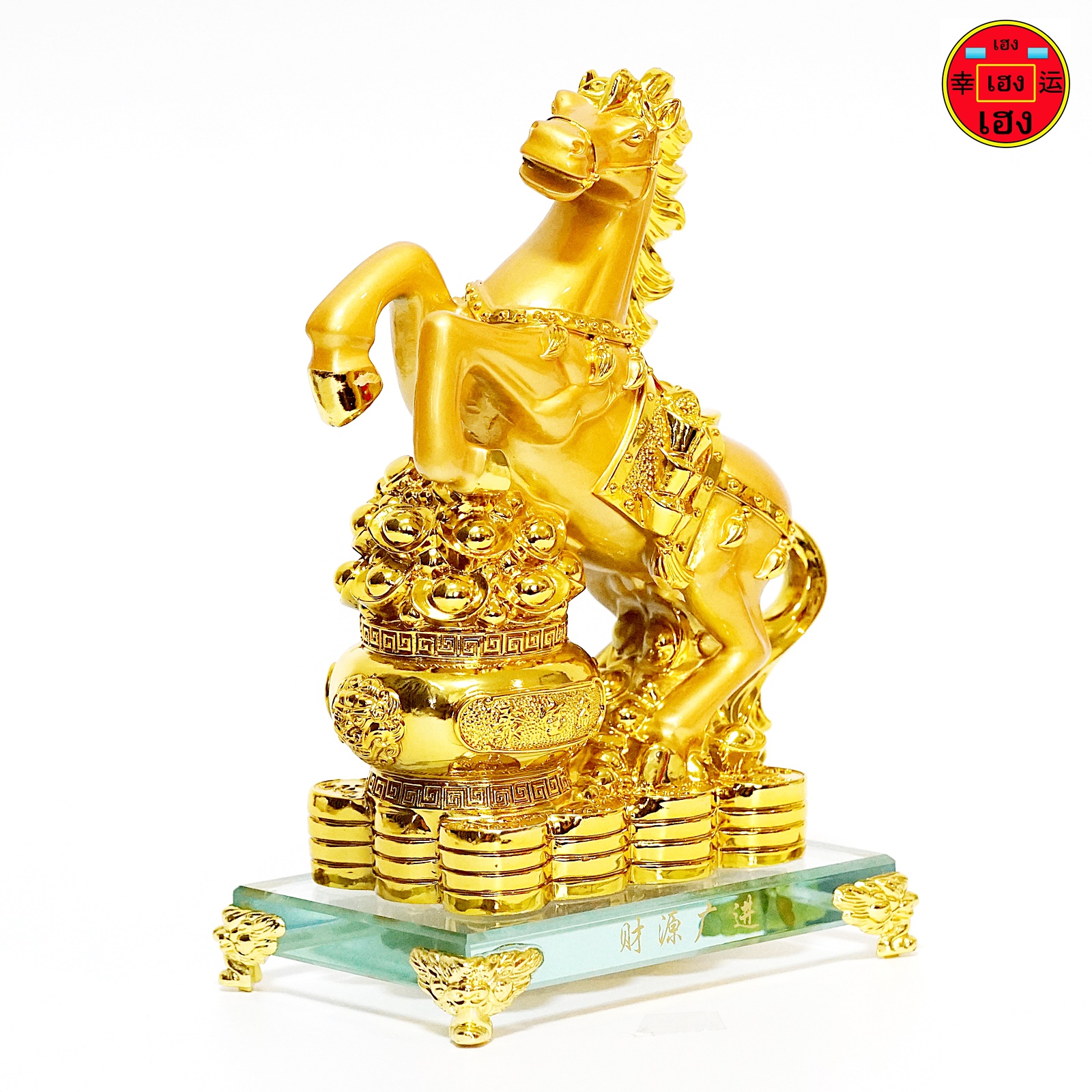 ตามฮวงจุ้ย ม้า มีธาตุไฟเป็นธาตุธรรมชาติ ม้าเป็นสัตว์ในลำดับที่ 7 ของนักษัตร หรือ ปี มะเมีย มีความเชื่อว่าม้าเป็นสัตว์ที่เปี่ยมไปด้วยพลังและเป็นสัญลักษณ์ของขุนนาง, ชนชั้นสูง, ความรวดเร็วว่องไว ส่งผลให้ธุรกิจการค้า, การงานเสริมเรื่องประสบความสำเร็จเร็ว การตั้งรูปปั้น ต้องให้หัวม้าหันหน้าเข้าสู่บ้าน สำนักงานหรือร้านค้าโดยยึดประตูเข้าออกเป็นหลัก ลักษณะของม้าที่เป็นมงคลคือ ลักษณะที่กำลังวิ่งหรือกระโจนทะยาน ดูมีชีวิตชีวา