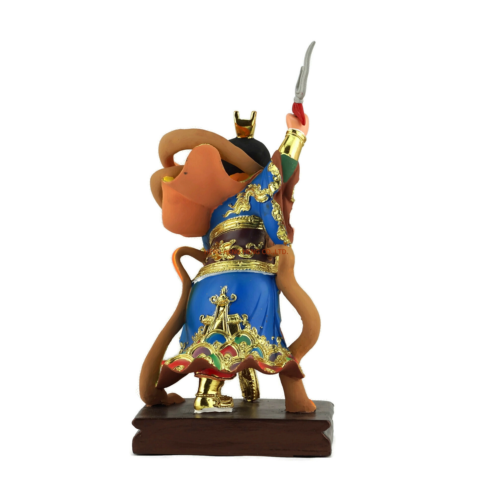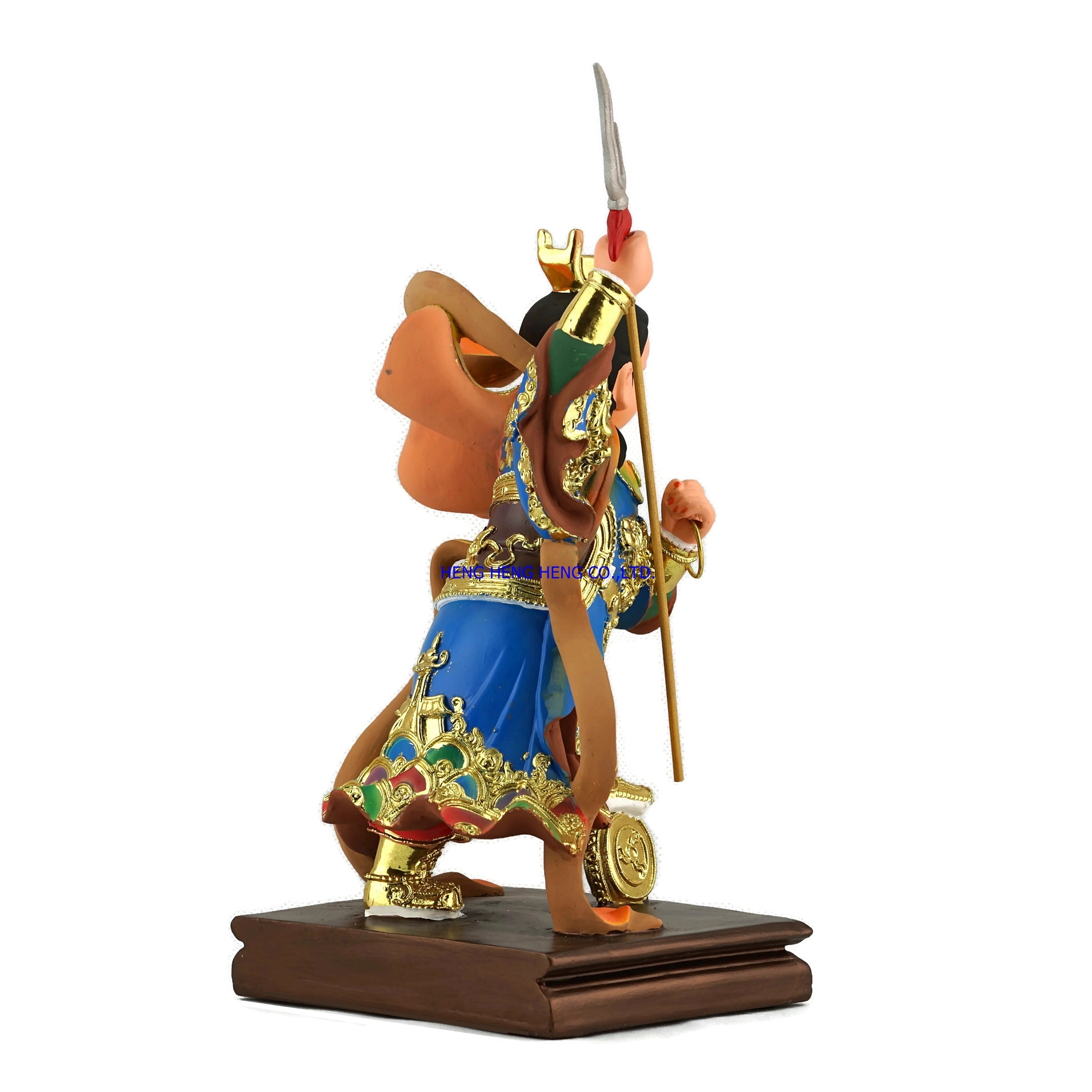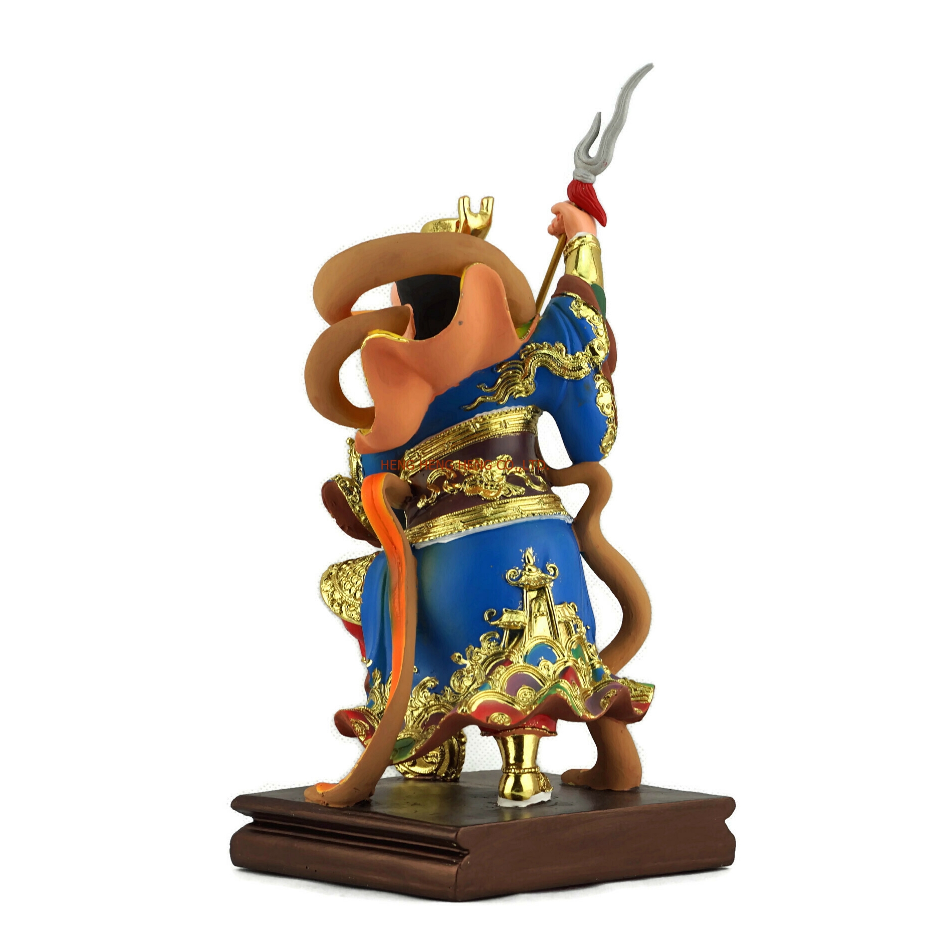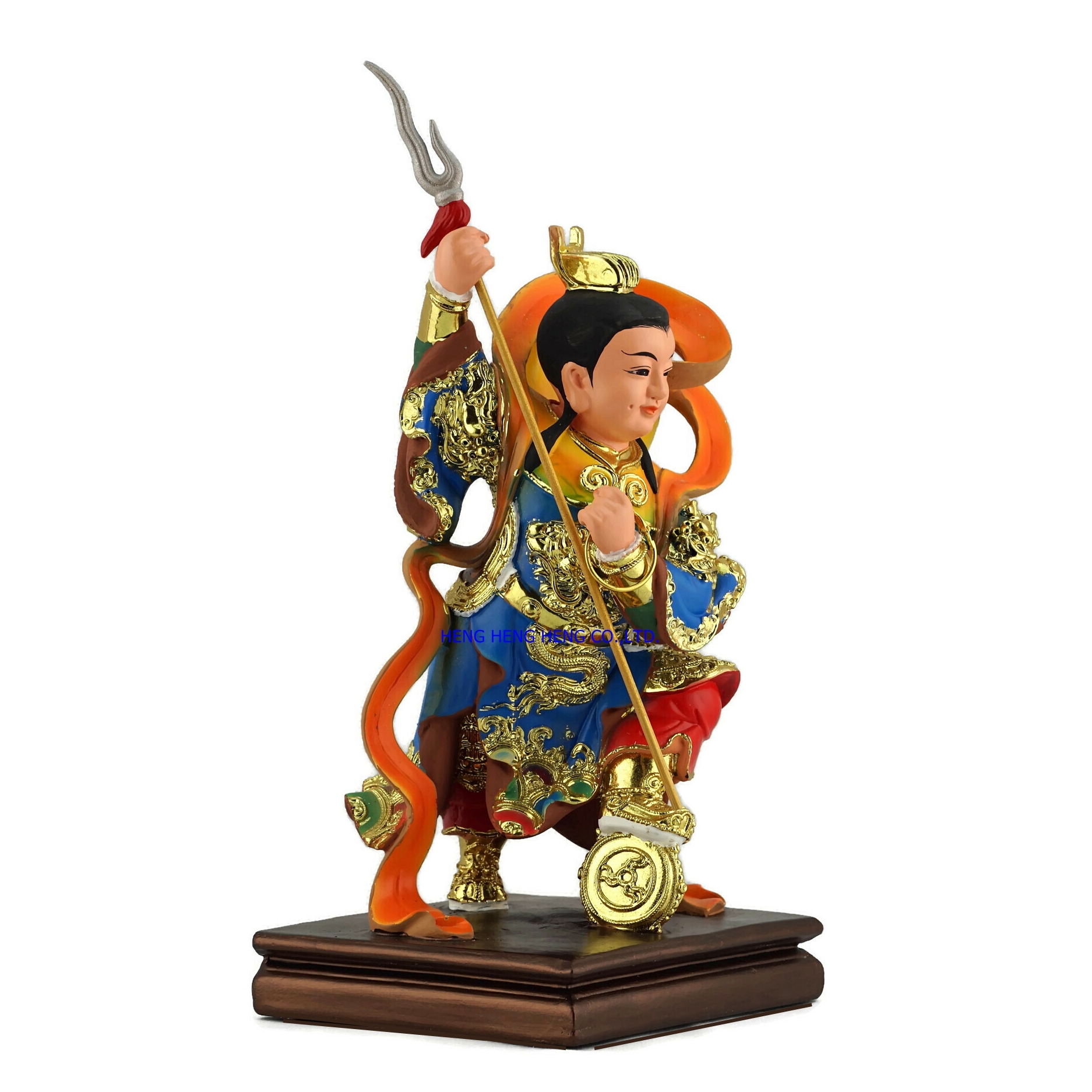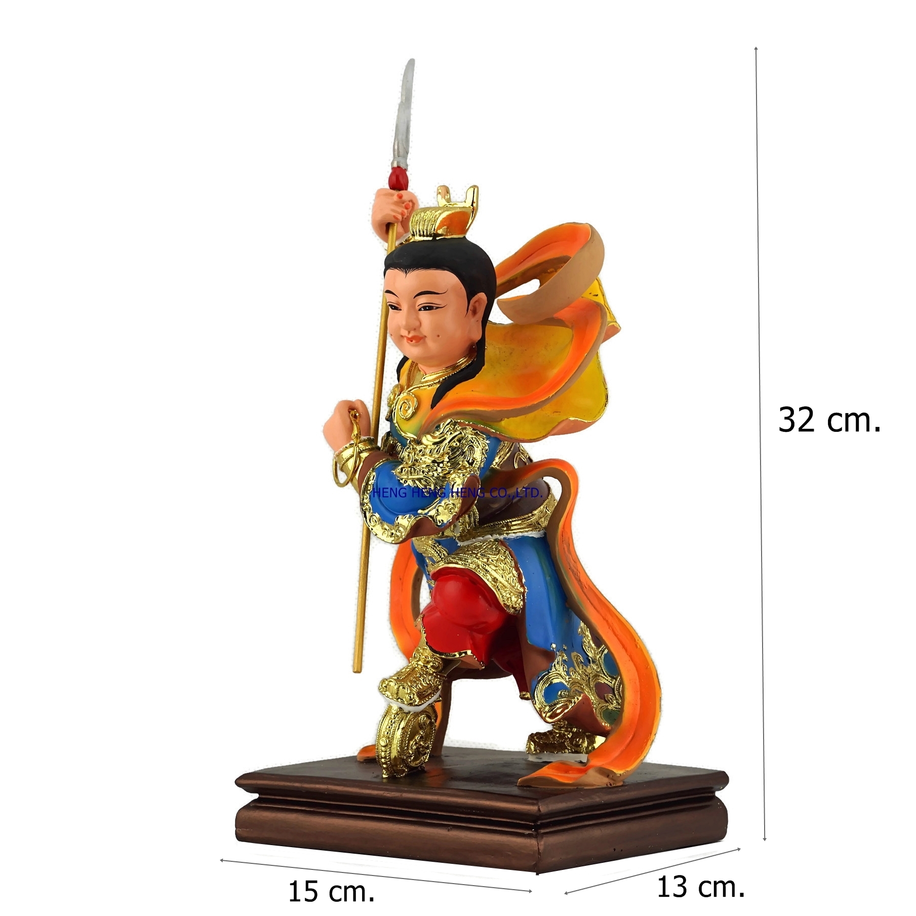 ● นาจาในชุุดเทพเจ้าสีน้ำเงิน ลายมังกรสีทอง นุ่งกางเกงสีแดง พร้อมอาภรณ์สีส้ม มือขวาถือหอก มือซ้ายถือบ่วง ยืนบนล้อไฟ ใบหน้าสดใส งานคัดเกรดคุณภาพ